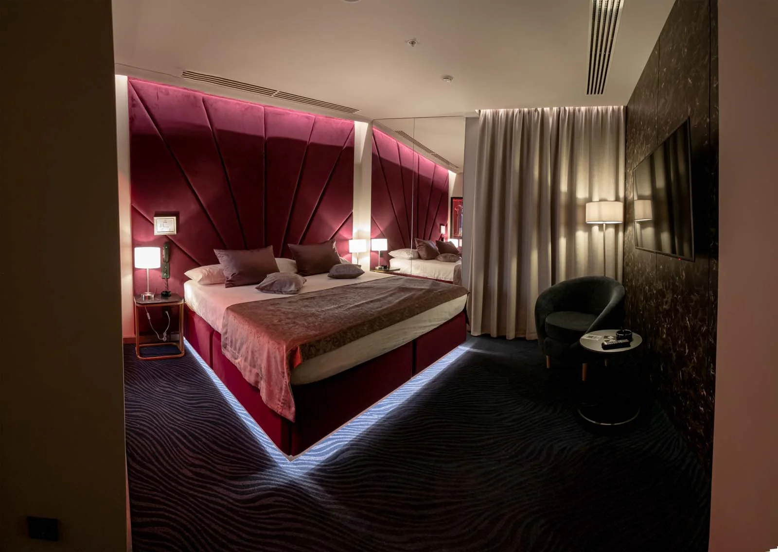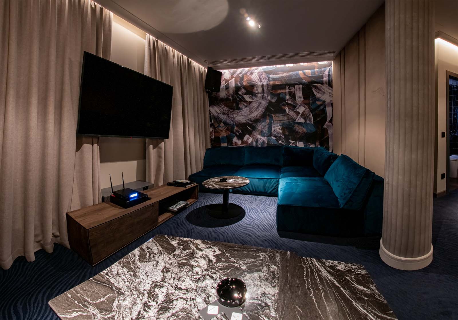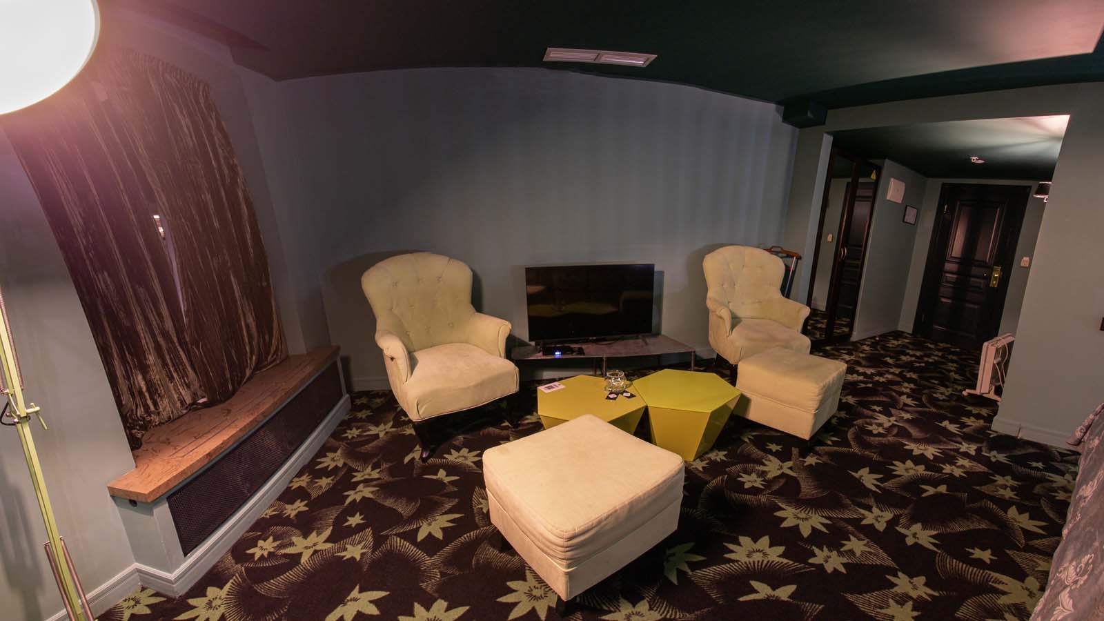 Стильный и очень просторный трехкомнатный номер с двумя спальнями и гостиной. В спальнях - широкие двуспальные кровати, шторы black-out.В гостиной - мягкая мебель, большой TV, проектор и караоке с акустической системой.