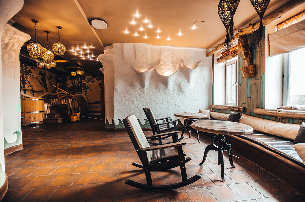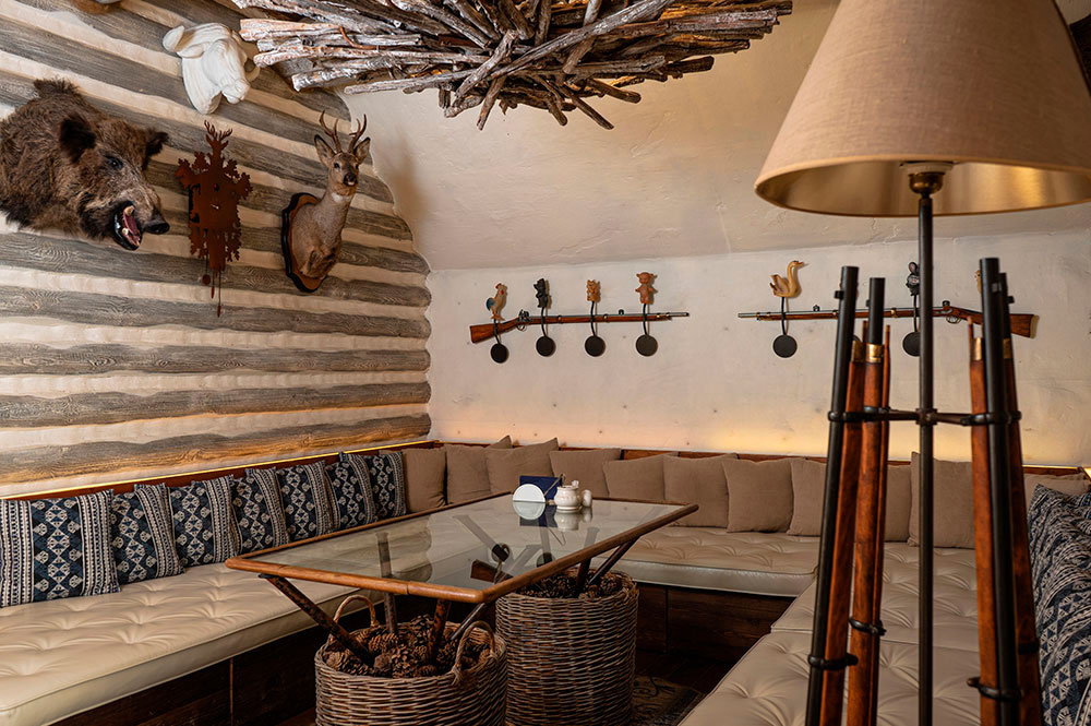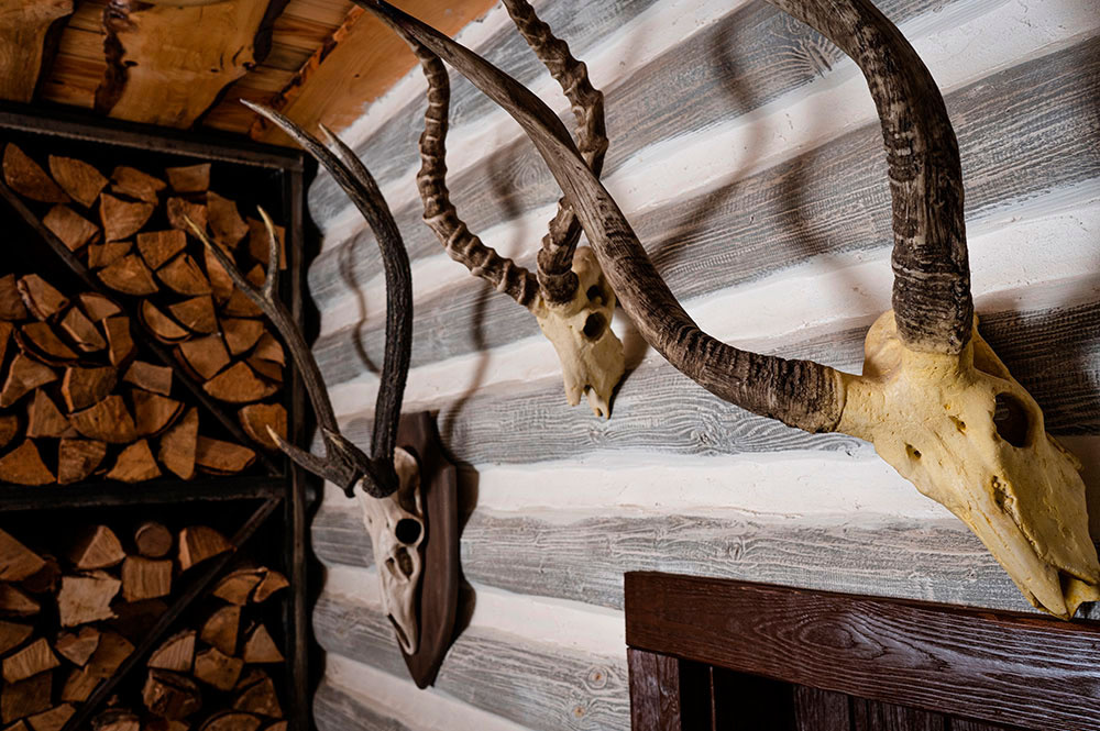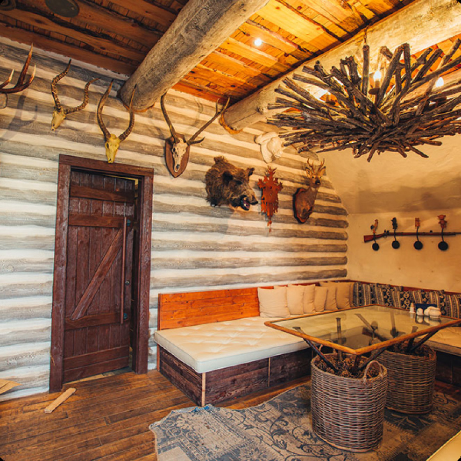 Комплекс в виде охотничьего домика в стиле дикой природы. Украшен настоящими чучелами животных, наполнен интересными охотничьими деталями. Это создаёт особую атмосферу, которую ценят мужчины.