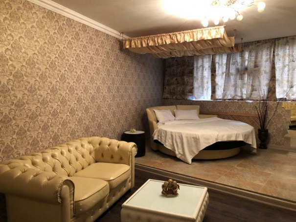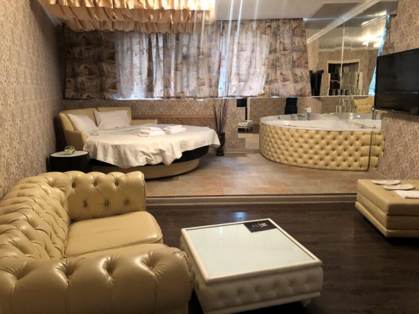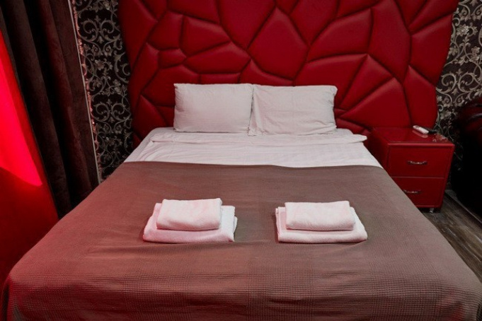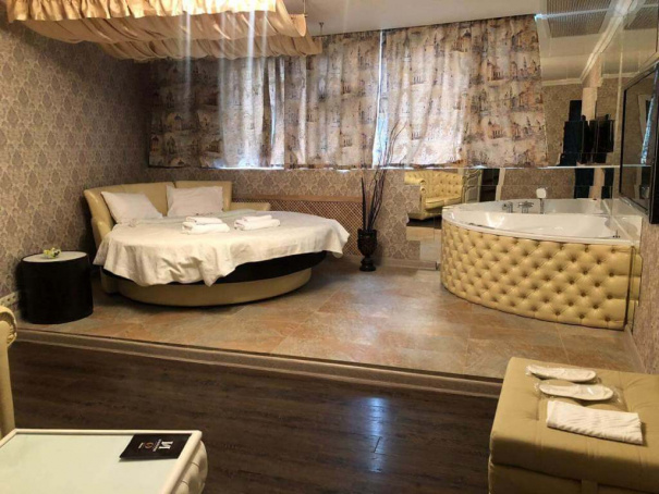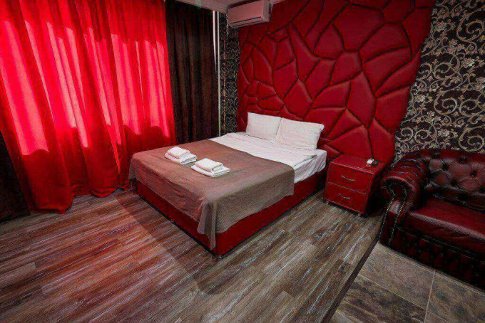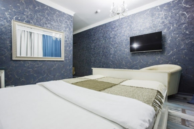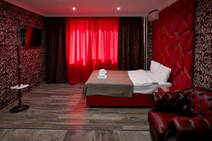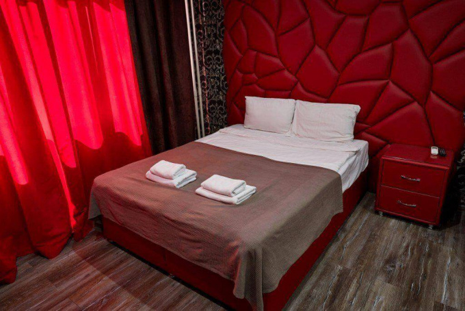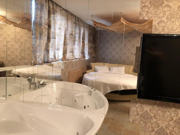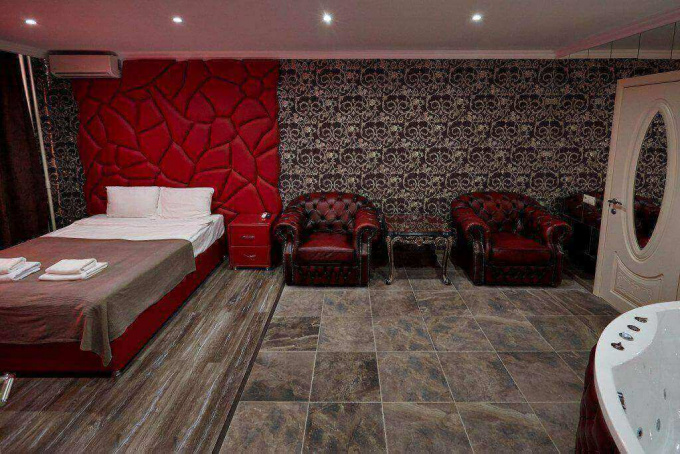 Размеры спальное места нестандартны - 1800х2000мм. У изголовья кровати расположены прикроватные тумбы. Их дизайн необычен. Уют дополняет зеркальное полотно, мягкое кресло и пуфик. В номере есть LCD-телевизор (42 дюйма). А также угловая ванна джакузи. Номер укомплектован туалетными принадлежностями, полотенцами, тапочками. Здесь есть все для комфортабельного отдыха.