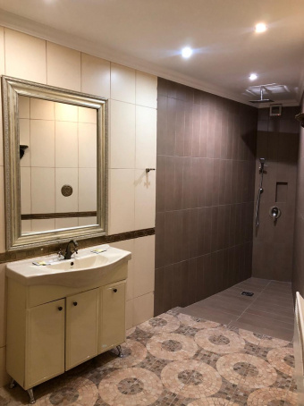 Кожаный диван, передвижной стеклянный журнальный столик, кожаный шезлонг. Телевизор 42". Отделанная мрамором ванная комната с джакузи. Роскошные халаты, одноразовые тапочки, комплект полотенец, средства для душа. Туалетные принадлежности и фен по запросу.