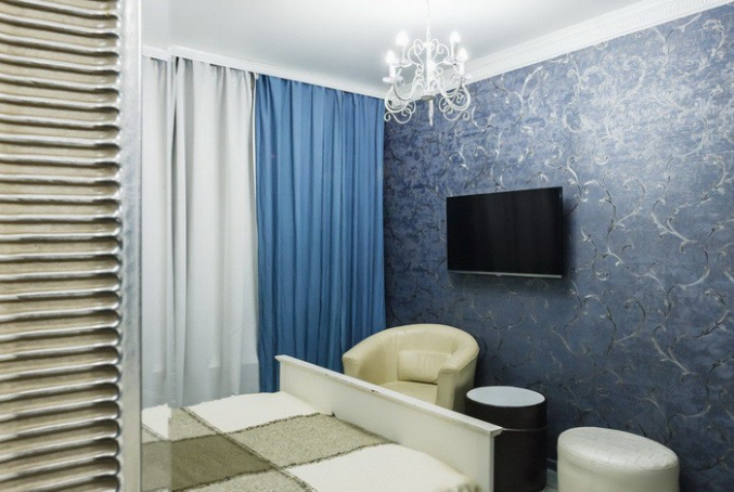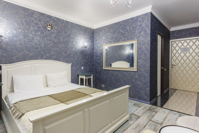 Номер «Синий LUX» выполнен в строгом классическом стиле. Настоящим центром номера является большая кровать с высоким изголовьем. Такая мебель укомплектована ортопедическим матрасом с оптимальным соотношением мягкости и жесткости, что идеально для хорошего сна и полноценного отдыха. Кровать достаточно большая и просторная.