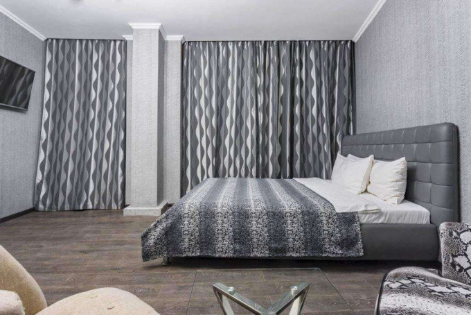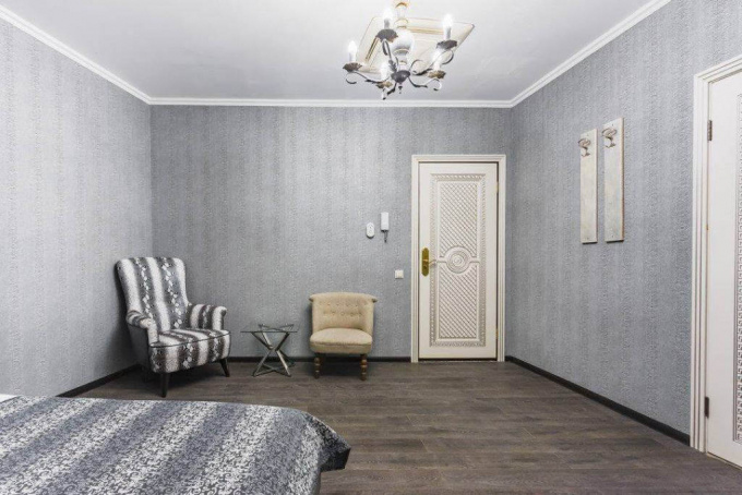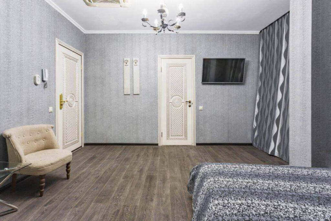 Небольшой, но стильный и уютный номер отеля отлично подойдет для отдыха. Современный интерьер выполнен в классическом стиле и спокойных серо-бежевых тонах. В комнате есть большая кровать с мягким высоким изголовьем и ортопедическим матрасом, квадратные кресла, журнальный столик, телевизор со спутниковыми каналами, кондиционер, ванна и санузел. За освещение отвечают изящная люстра в центре потолка и настенный светильник у входа. Есть все необходимые условия для приятного досуга в хорошей компании.
