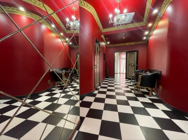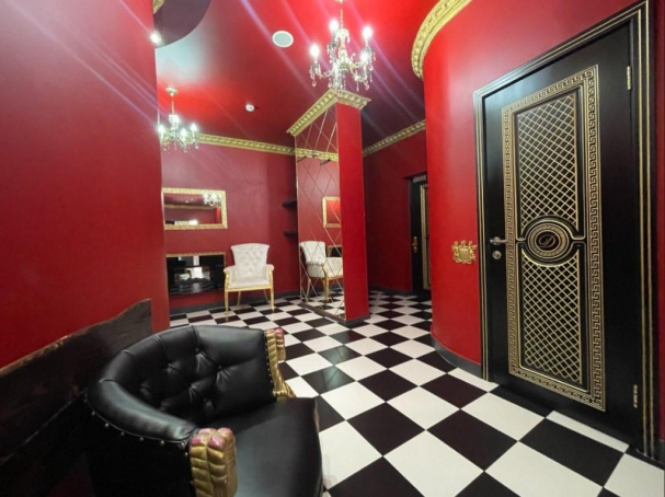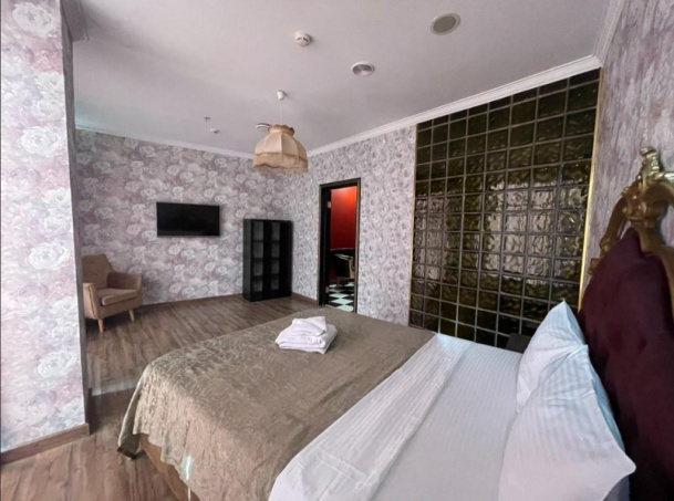 Респектабельный номер с дорогой отделкой. Интерьер выполнен по индивидуальному дизайн проекту. Просторная прихожая, она же гостиная - в красных тонах с позолоченной лепниной на двухуровневом потолке. Ярко-алая отделка стен прекрасно гармонирует с черно-белым шахматным полом. Имеются две группы дорогих кожаных кресел. Одна – ближе к входу, рядом с электрокамином и зеркальным телевизором (белая стеганая кожа и золотые фигурные элементы), вторая – ближе к спальной вокруг резного столика из цельного массива дерева (черная кожа, позолоченные витые ножки и подлокотники). Кровать в спальной украшена резной деревянной спинкой с затейливым орнаментом, обита натуральной кожей. Стены оформлены насыщенными растительными узорами в мягких тонах. Перегородка из непрозрачных стеклоблоков отделяет спальную от ванной комнаты, где расположена просторная ванна и другие удобства.