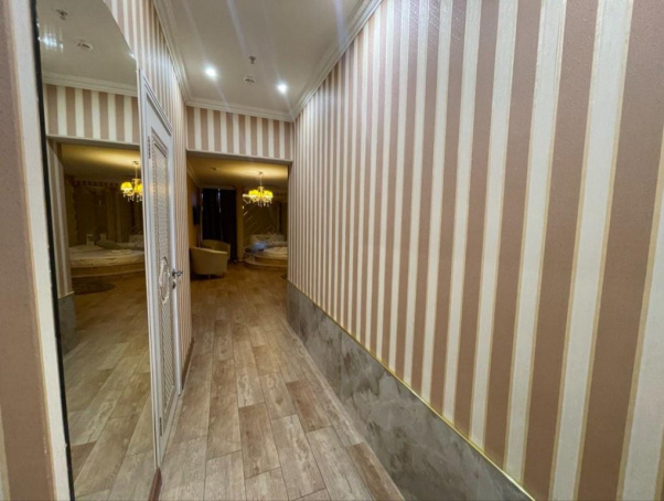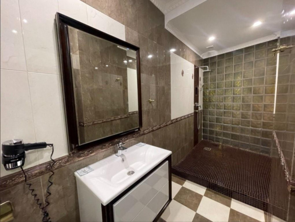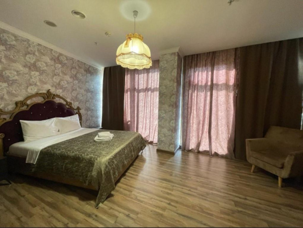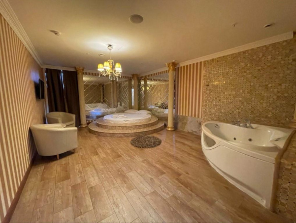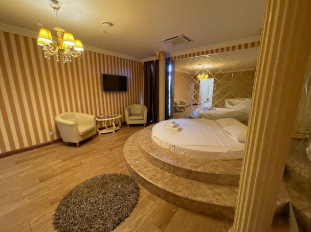 Номер повышенной комфортности. Богатая отделка выполнена в спокойных, расслабляющих тонах. Обитая натуральной кожей мебель придает интерьеру респектабельность. Большая кожаная кровать с мягким стеганым изголовьем очень удобна. Напротив нее расположена гидромассажная ванна, находясь в которой, можно смотреть зеркальный телевизор на стене. Эти две части интерьера визуально разделены разным оформлением стен и пола. Хорошо продумана система освещения. Есть центральная витая люстра и небольшие настенные светильники. Имеется отдельная душевая комната.