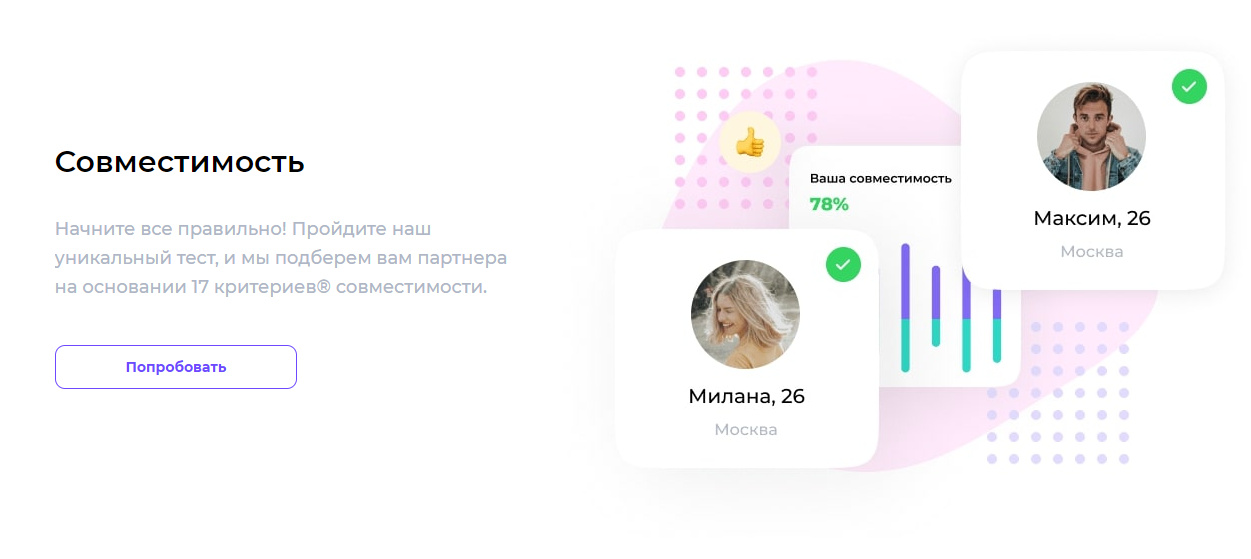 Хорошим претендентом на роль лучшего из них выступает Teamo. Проект прямо указывает на то, что здесь все серьезно. Все участники проходят психологическое тестирование,на основе которого формируется подбор возможных пар. Без сформированного психологического портрета к поиску анкет здесь не пустят, сначала потребуется откровенно и подробно рассказать о себе. Упор на совместимость и свыше 22 миллионов активных пользователей однозначно делают этот сервис интересным для тех, кто хочет найти свою вторую половинку.